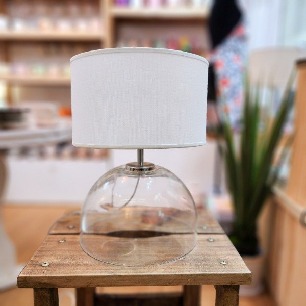 Lampara con base de vidrio y pantalla lisa. No incluye lamparita.