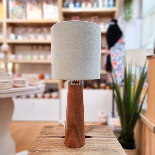 Lampara con pantalla tipo tusor y pie de madera. No incluye lamparita.
