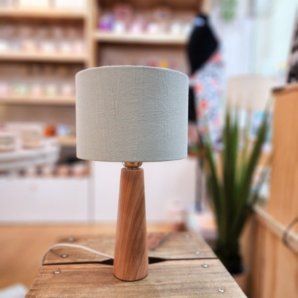 Velador con pantalla tipo tusor y pie de madera. No incluya lamparita.